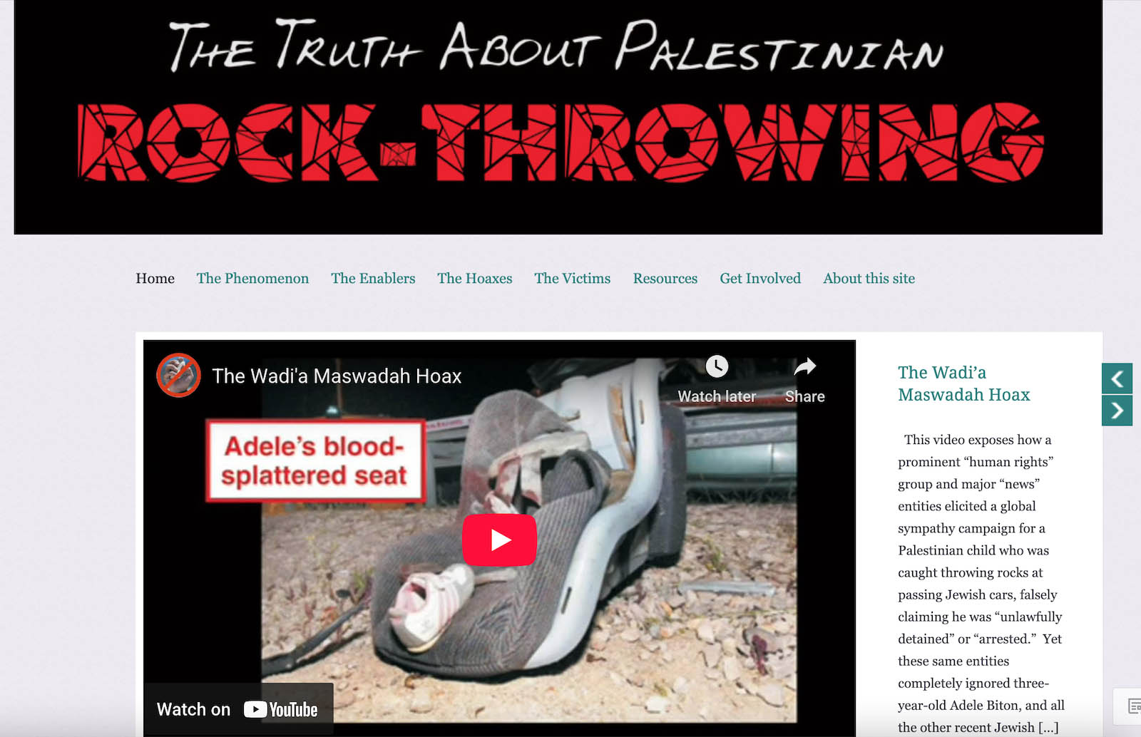 In 2013, I produced two short documentaries, and a website, “The Truth About Rock-Throwing,” that expose this Palestinian terror method, the victims of it, and the Western MSM’s pro-terrorist, anti-Semitic bias in covering such incidents. The documentaries:
