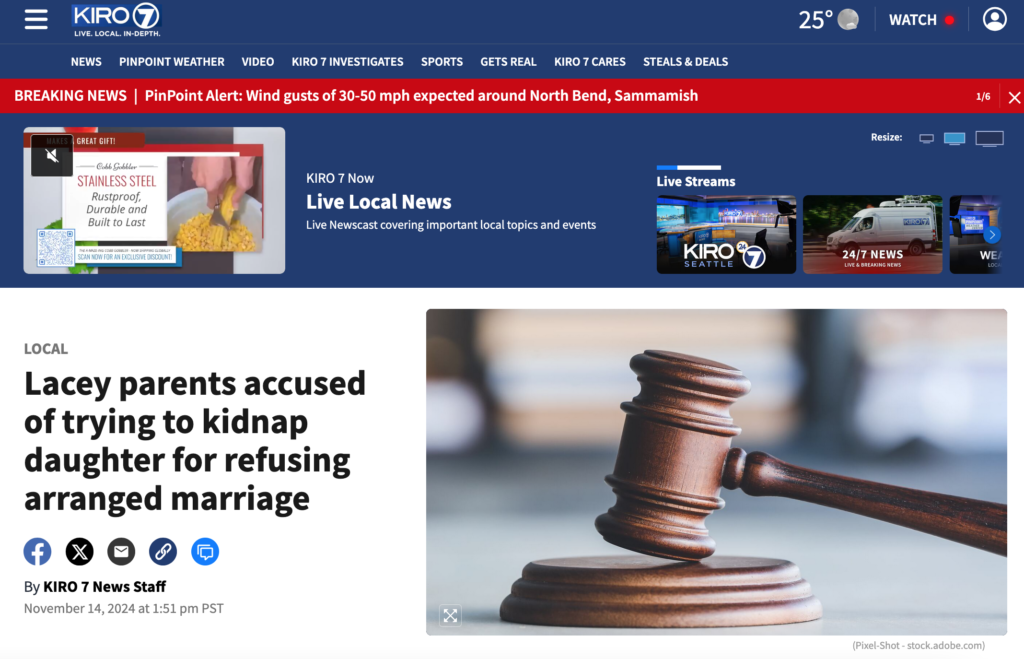 Lacey parents accused of trying to kidnap daughter for refusing arranged marriage, KIRO 7 News Seattle November 14, 2024